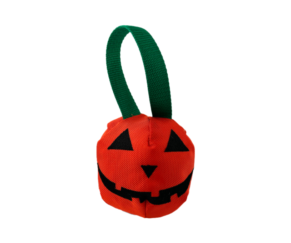 Pumpkin tug with treat hiding pouches. It crinkles, it squeaks and is great for aggressive players. Toss it, Tug it, and hide treats to elevate play. Made by the American Dog Company.